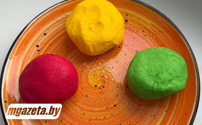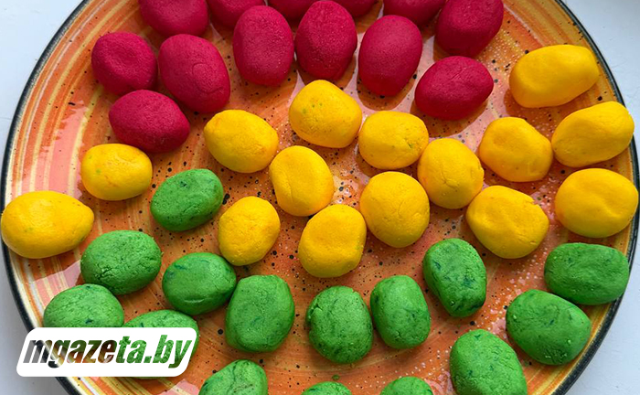 В яичный белок добавляем лимонную кислоту и взбиваем до легкой пены с помощью венчика. Всыпаем сахарную пудру и смешиваем сначала с помощью лопатки, а затем вымешиваем руками до пластичного однородного состояния около 1 минуты (количество пудры определяется по эластичности массы). Делим массу на три части и добавляем в каждую цветной ванильный сахар. Вымешиваем до момента распределения красителя. Можно вымесить не до конца, чтобы получился мраморный эффект. Делать это лучше в перчатках.