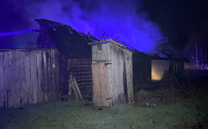 В результате пожара повреждена крыша деревянной постройки по всей площади, выгорели стены.