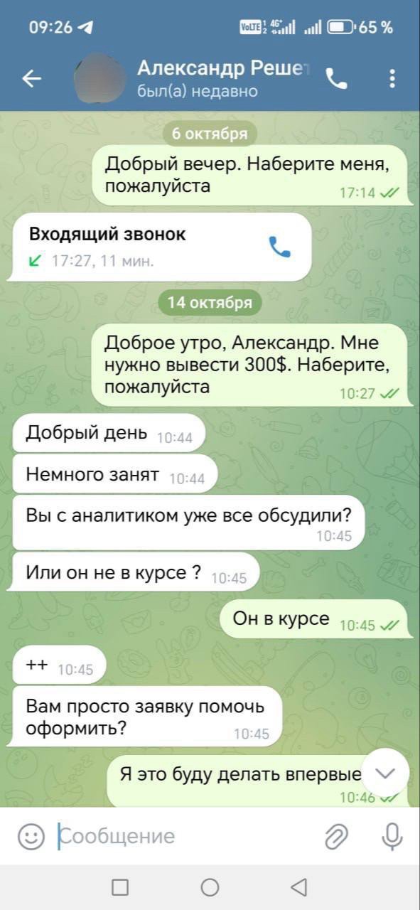 В течение месяца горожанка активно вкладывала денежные средства в онлайн-платформу и общалась с аналитиком компании. Увидев круглую сумму, женщина попросила «наставника» помочь ей с выводом заработанных денег. «Сотрудник» предупредил, что в данный момент введены ограничения на вывод денежных средств, и предложил оформить заявку для подобной процедуры.
