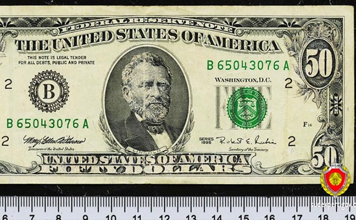 По выводам судебного эксперта, исследуемый денежный билет Федеральной резервной системы США номиналом $5 изготовлен предприятием, осуществляющим производство продукции данного вида. В денежный билет внесены изменения: наклеены в отдельных местах фрагменты бумаги с изображениями чисел, текста и лица мужского пола, соответствующими номиналу $50, выполненные способом электрофотографической печати. Таким образом, номинал купюры был увеличен в 10 раз.