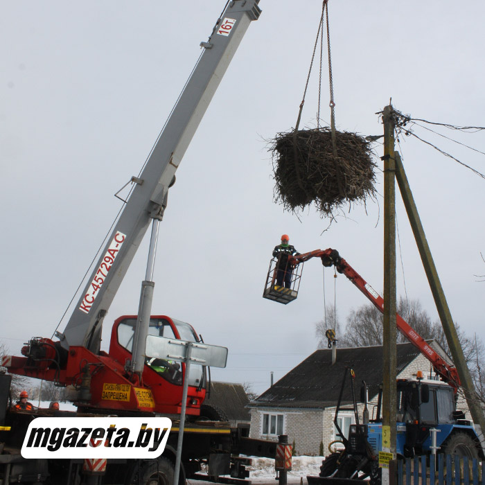Работники филиала «Молодечненские электрические сети» РУП «Минскэнерго» с помощью крана аккуратно сняли с опоры довольно большое гнездо, которое весило несколько десятков килограммов, опустили его на землю. Затем специалисты установили на опору платформу и вернули дом для пернатых на место. Уже скоро, когда аисты возвратятся из теплых краев, они воспользуются модернизированным жилищем.