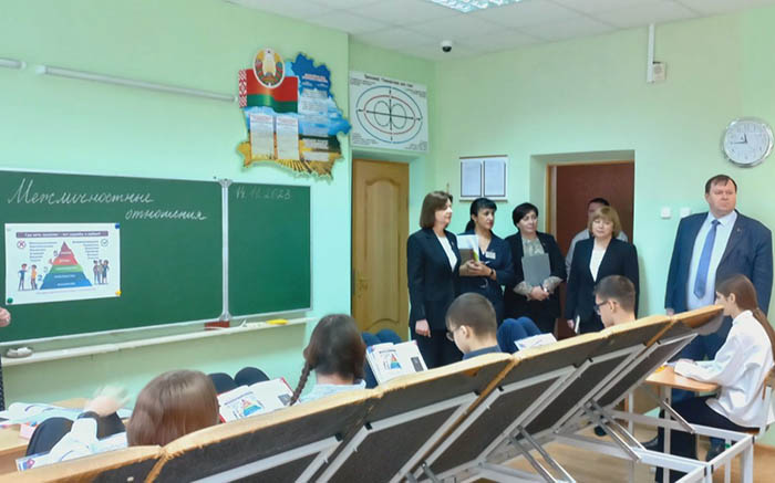 В программе посещения ознакомление с учреждением, общение с учащимися, диалог с коллективом. В мероприятии принимают участие председатель районного Совета депутатов Андрей Паукшта, начальник управления по образованию райисполкома Людмила Кохановская, заместитель начальника отдела экономики райисполкома Маргарита Бурлакова.