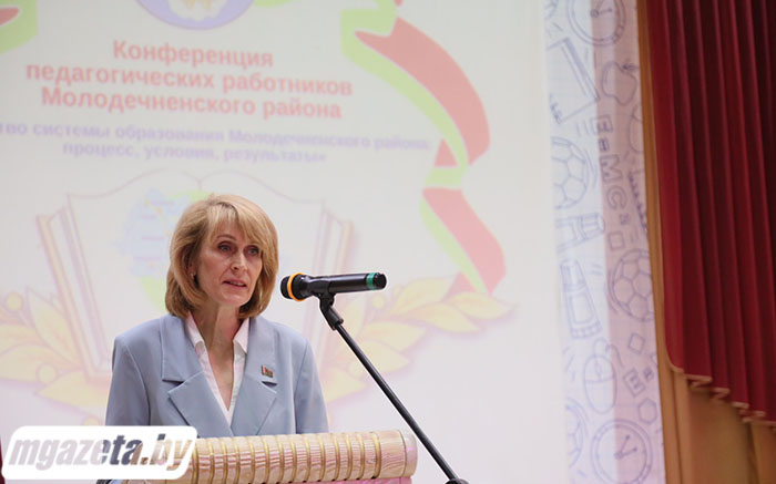 От имени участников районной педагогической конференции с началом трудового пути молодежь поздравила член Постоянной комиссии Совета Республики Национального собрания Республики Беларусь по образованию, науке, культуре и социальному развитию, директор Молодечненской специальной школы-интерната Наталья Глинская.