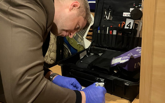 Александр Красовский, следователь по ОВД криминалистического отдела УСК по Минской области, продемонстрировал студентам процедуру получения образцов – отпечатков пальцев. Возможность «откатать пальчики» была у каждого. А процесс обнаружения отпечатков на бумаге с помощью специального порошка привел в восторг даже преподавателя. Вооружившись ультрафиолетовым фонариком, студенты искали, и, надо отметить, успешно, следы преступления, не видимые глазу, но имеющие значение в расследовании, например, биологические.