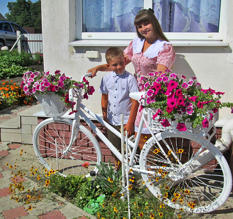 Дзякуючы фантазіі і ўмелым рукам гаспадароў стары веласіпед ператварыўся ў стыльную кветачніцу. Вольга і яе сын Максім задаволены вынікам.