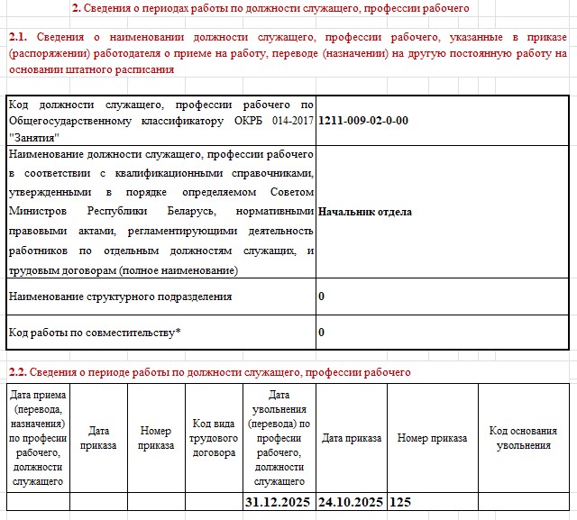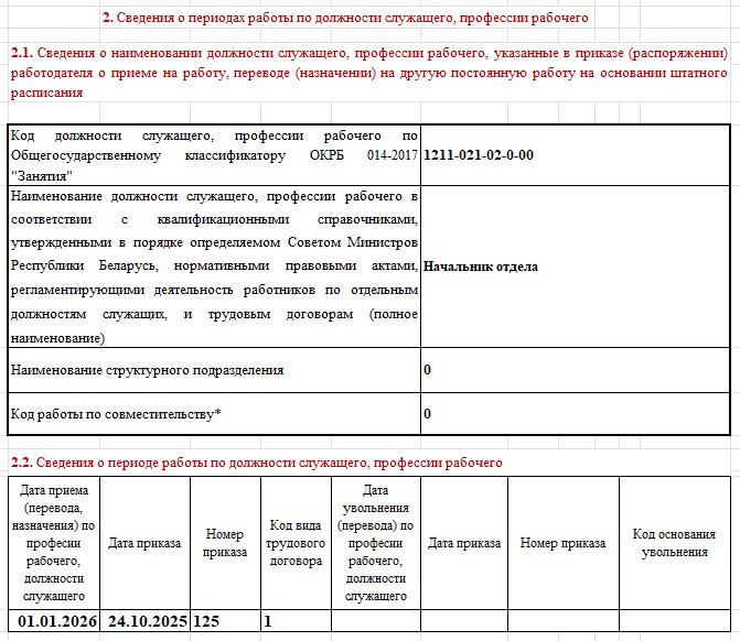 Так как в подразделе 2.1 «Сведения о наименовании должности служащего, профессии рабочего, указанные в приказе (распоряжении) работодателя о приеме на работу, переводе (назначении) на другую постоянную работу на основании штатного расписания» раздела 2 «Сведения о периодах работы по должности служащего, профессии рабочего» (раздел 2) сведений о приеме и увольнении по форме ПУ-2 (форма ПУ-2) указывается код должности служащего, профессии рабочего по общегосударственному классификатору ОКРБ 014-2017 «Занятия», а в подразделе 2.2 «Сведения о периоде работы по должности служащего, профессии рабочего» (подраздел 2.2) раздела 2 формы ПУ-2 периоды работы по определенной должности служащего (профессии рабочего), то все изменения, затрагивающие наименования должностей служащих (профессий рабочих), необходимо отразить в форме ПУ-2.