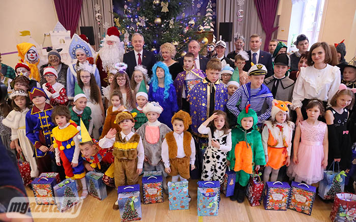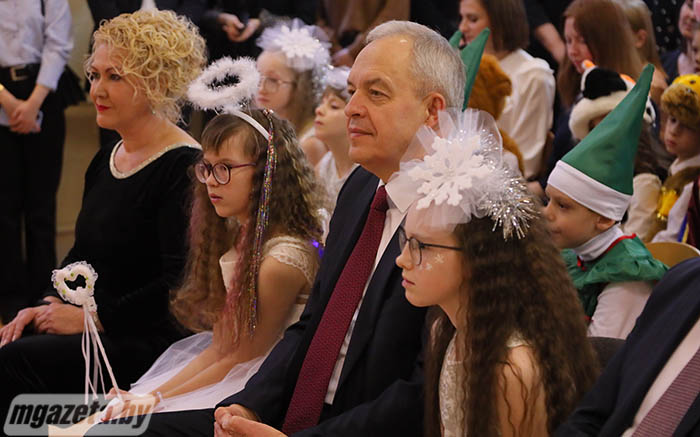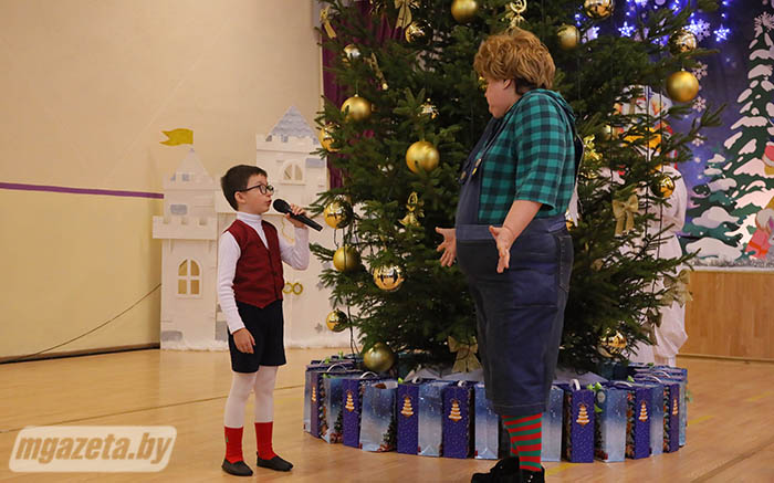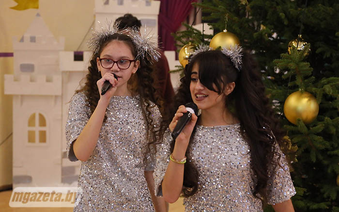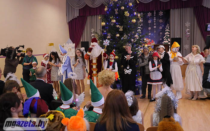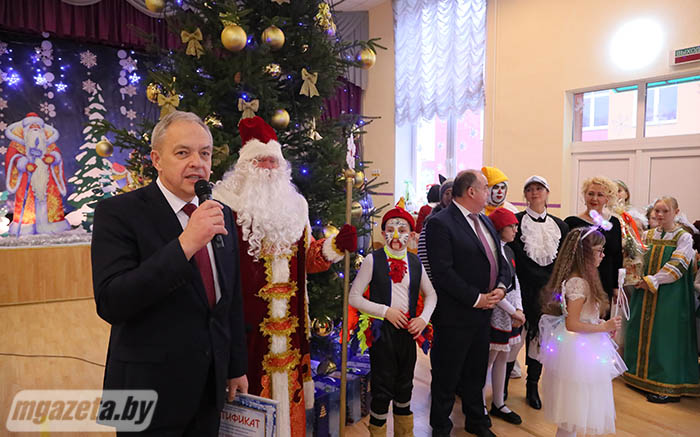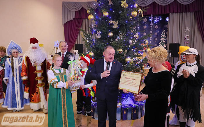 Почетные гости поздравили учащихся и педагогов с наступающим Новым годом. Игорь Сергеенко передал учреждению образования сертификат на игровой уличный комплекс, Иван Маркевич -- сертификат на приобретение цифрового пианино и проектора. От Молодечненского райисполкома воспитанники школы-интерната получили сладкие подарки.
