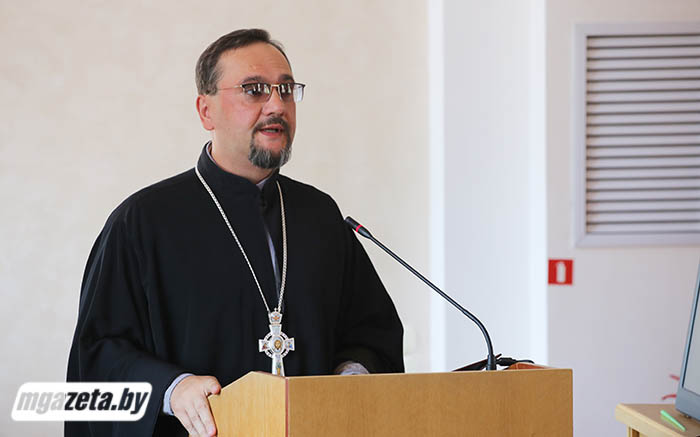 Секретарь Молодечненской епархии, благочинный церквей Молодечненского округа, настоятель храма Покрова Пресвятой Борогодицы в Молодечно протоиерей Виталий Богданёнок остановился на вопросах духовно-нравственной и патриотической работы с населением епархии. Основная тема его выступления -- защита традиционных ценностей и института семьи.