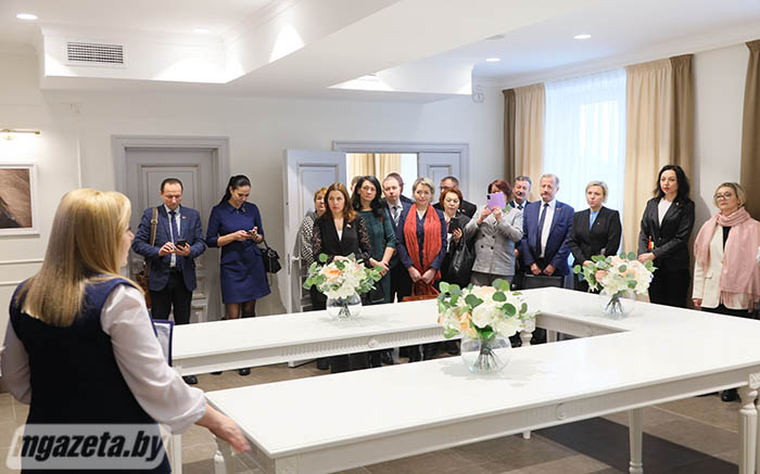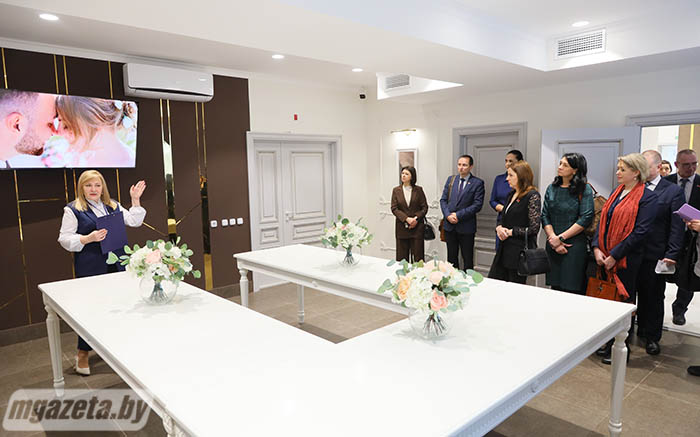 В ЗАГСе состоялись экскурсия по учреждению и пленарное заседание, на котором были рассмотрены актуальные вопросы, посвященные системе контроля за рассмотрением обращений граждан и юридических лиц, работе программного комплекса «Одно окно». Участники семинара также ознакомились с результатами работы в 2023 году с обращениями граждан, шла речь о выявленных нарушениях при исполнении райгорисполкомами административных процедур.