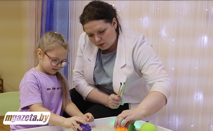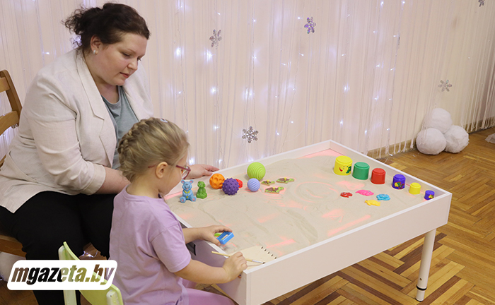 Учреждение образования посещает 158 воспитанников, из них 94 имеют особенности психофизического развития: нарушения зрения, тяжелые нарушения речи, расстройства аутистического спектра. Стол для рисования песком с подсветкой представляет собой эффективный инструмент, который играет значимую роль в развитии и реабилитации детей дошкольного возраста с особенностями психофизического развития. Использование его в работе позволяет решать ряд задач в различных коррекционных направлениях. Работа с песком развивает тактильное и зрительное восприятие, успокаивает, тренирует мелкую моторику и зрительно-моторную координацию. Подобная деятельность – безопасный способ выразить чувства, снизить тревожность и снять напряжение. Она помогает проявить себя детям с трудностями в речи, развивает воображение, стимулирует внимание, пространственное мышление и способность к обучению. Занятия улучшают навыки взаимодействия и общения.