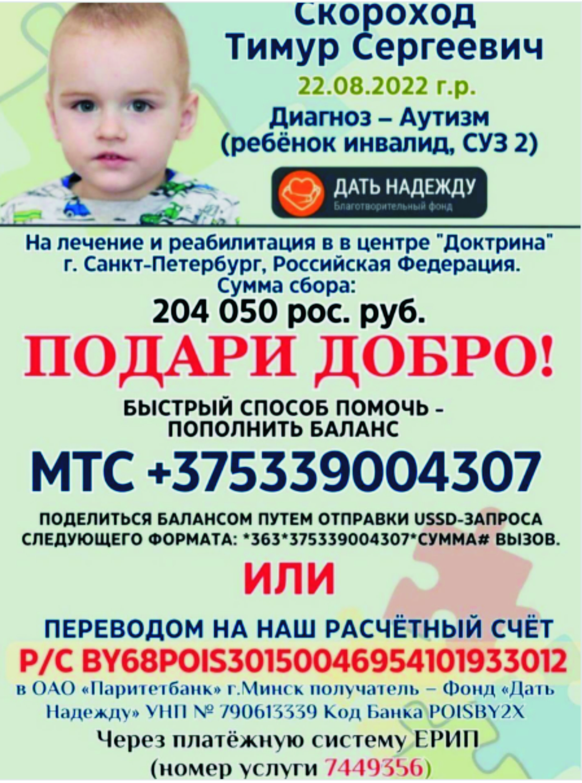 Скороход Тимур Сергеевич 22.08.2022 г.р. Родился в многодетной семье и был долгожданным пятым ребенком. До полутора лет Тимур, развивался и рос, как все остальные дети. Но однажды мама заметила, что, играя с игрушкой, он перестал смотреть в глаза. С этого момента обеспокоенная, она стала пристально наблюдать за развитием сына. Когда малышу исполнилось два года, мама забила тревогу. Затем началась череда реабилитаций в медицинском центре раннего развития города Витебска.