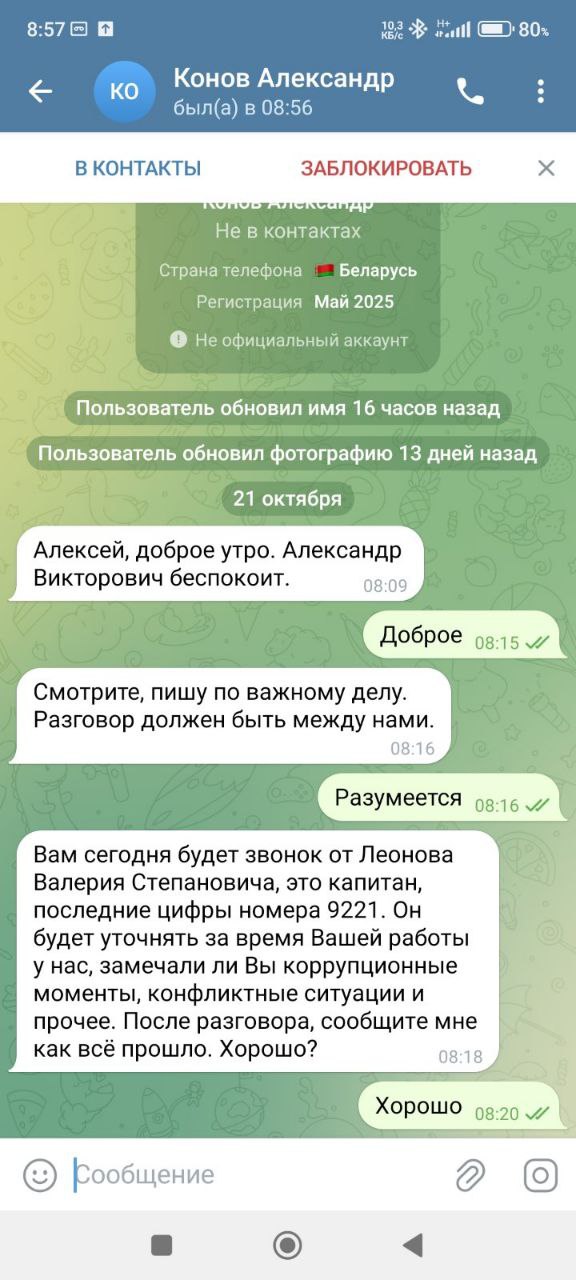 Сегодня по всей области (уже зафиксировано несколько случаев) от имени директора КУП "Молодечноводоканал" Александра Викторовича КОНОВА поступают сообщения работникам ЖКХ, с просьбой предоставить конфиденциальную информацию о других работниках.