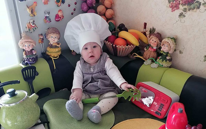 – Всё началось давно: Софиюшке только полгода исполнилось, – вспоминает мама. – В тот день, находясь на кухне у свекрови Лилии Владимировны, мне пришла идея запечатлеть малышку в образе маленького поваренка. София еще не умела уверенно сидеть, но, несмотря на это, фотография получилась восхитительной: доченька в колпаке и с поварешкой в руках вызвала восторг у всех близких.