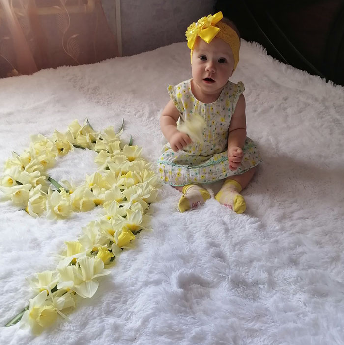 А потом завертелось. Наталья с особым трепетом подходила к каждому месяцу жизни своей доченьки и в преддверии очередной маленькой даты тщательно продумывала образ и декорации. Седьмой месяц – София в образе маленькой принцессы на покрывале из лепестков пионов, восьмой – в ванночке, наполненной клубникой, девятый – малышку окружала цифра из нарциссов.